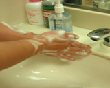 よく泡立てた石鹸と流水(水道水)で手を洗い、清潔なタオルで手を拭きます。