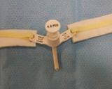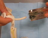 - 準備しておいた、新しい気管カニューレを「C」の字を書くように挿入します。(挿入の刺激で咳き込むことがありますが、慌てずに交換が終わってから吸引をします。)カニューレの本体部分に指を添えながら、オブチュレーター(カニューレの中のガイドワイヤー)を引き抜きます。(内筒が入った状態では呼吸ができないので注意!!)