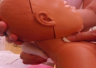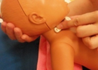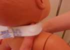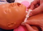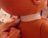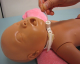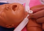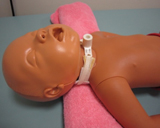 - 明るいところに子どもを寝かせます。首まわりがよく見えないときは肩枕をします。可能であれば、気管内吸引をしておきます。